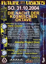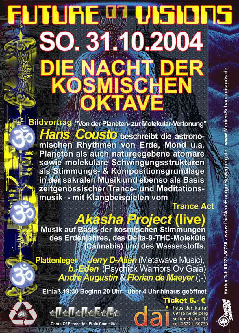 Offene Podiumsdiskussion "Was ist die Zukunft der psychedelischen Partykultur" im Rahmen der FUTURE VISIONS am Montag 1. 11. 2004 ab 20 Uhr im selben Veranstaltungsort;